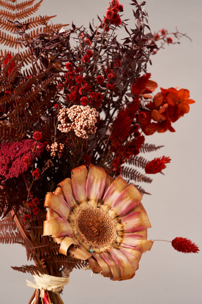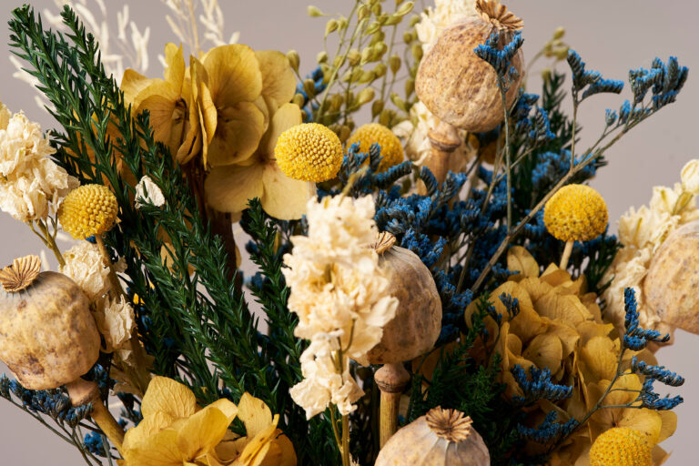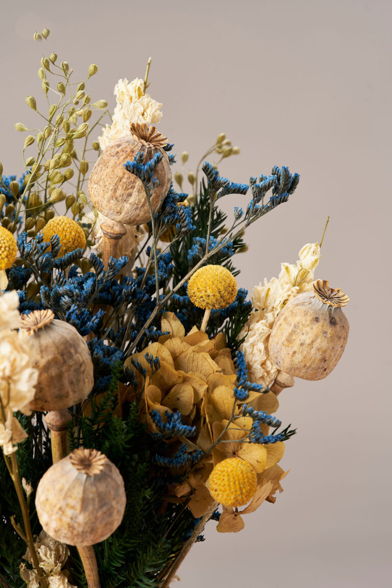 Ramo con carácter y personalidad. Hecho a base de una composición de flores preservadas en tonos neutros y azules que acompañarán a cualquier estancia.